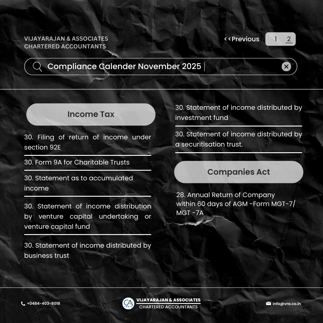 Vijayarajan & Associates - November 2025 Compliance Calendar – Key Tax, GST & Regulatory Deadlines