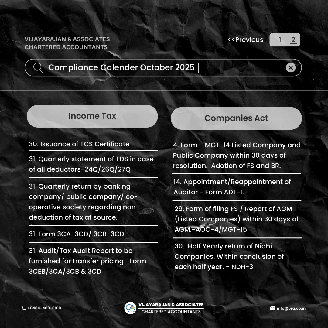 Vijayarajan & Associates - October 2025 Compliance Calendar – Key Tax, GST & Regulatory Deadlines